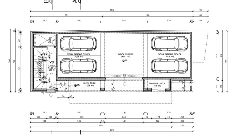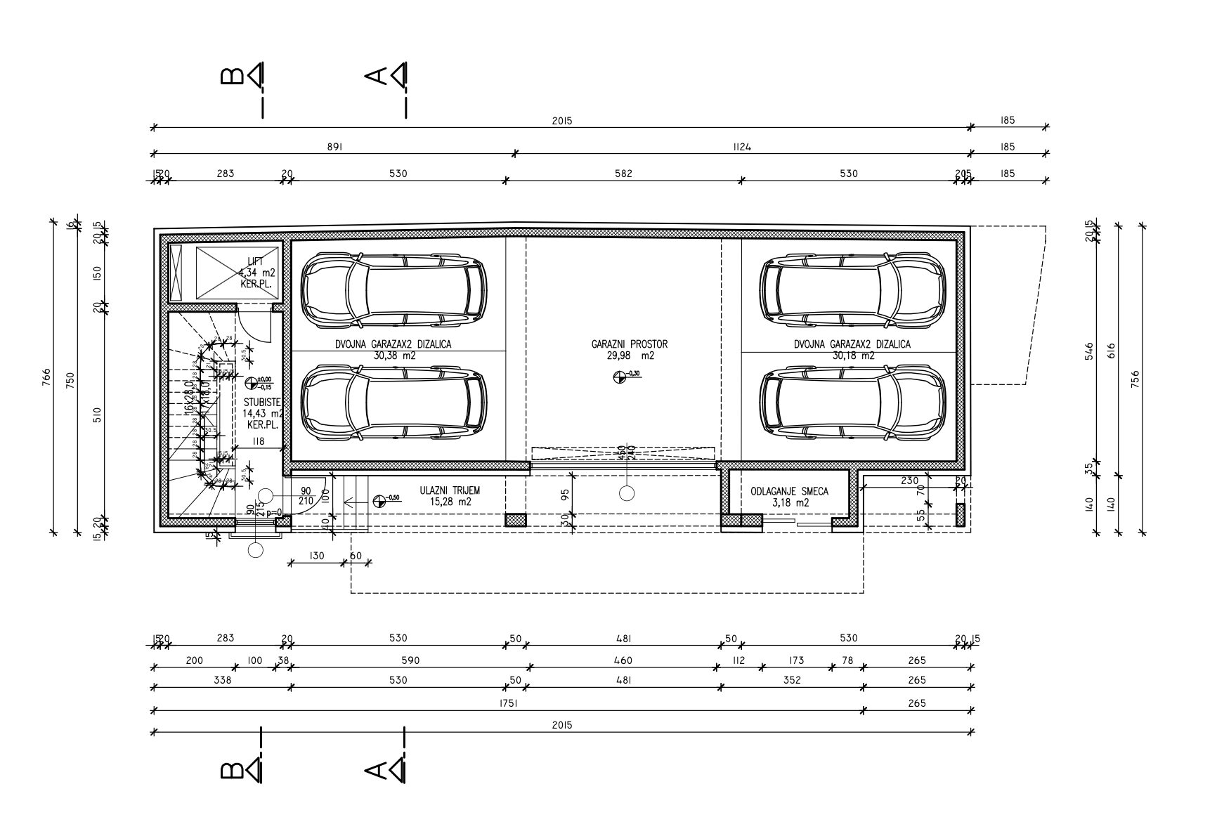 Two garage parking spaces (hydraulic scissors) must be purchased with the apartment. Approximately 15m2 each.