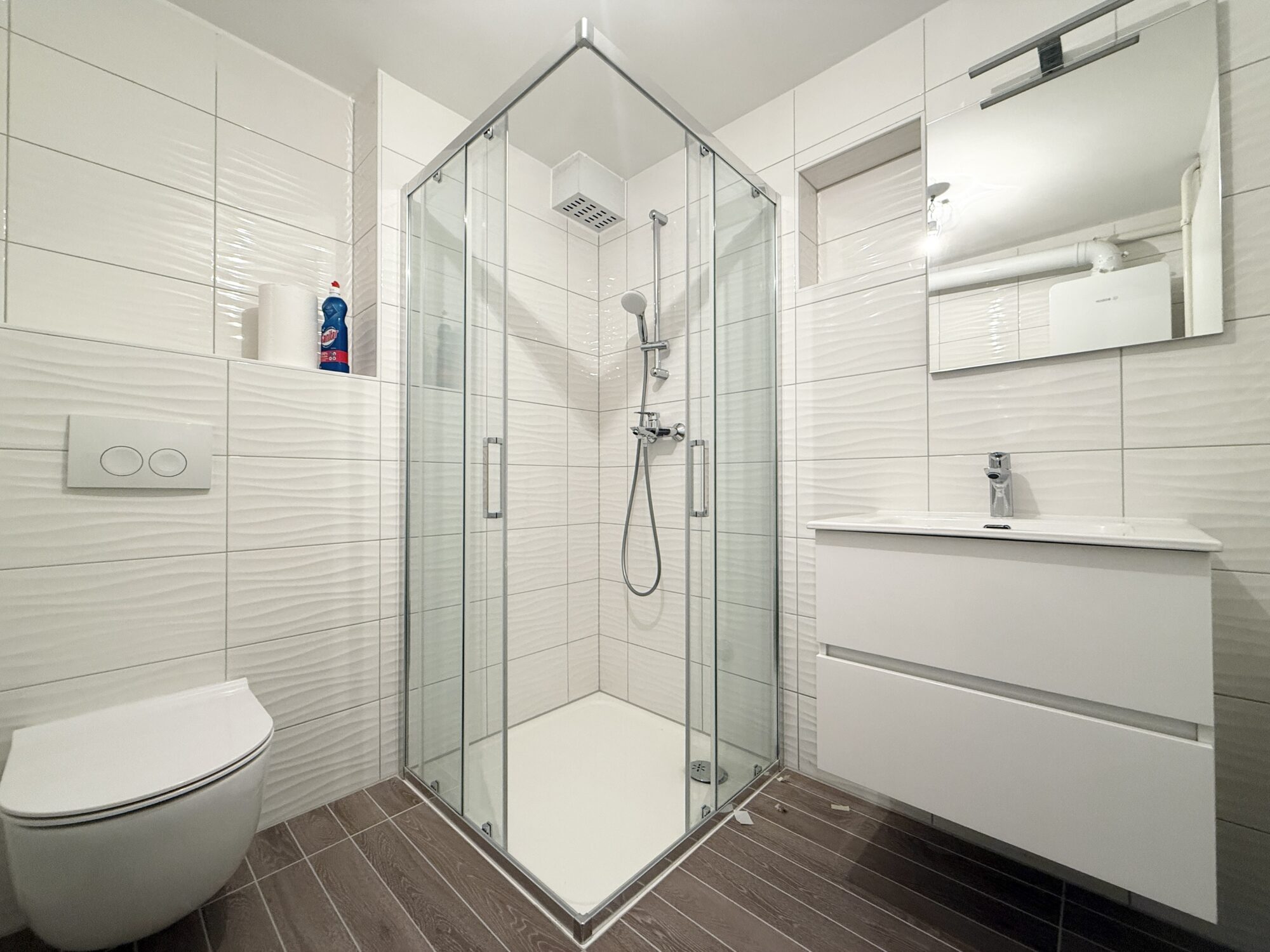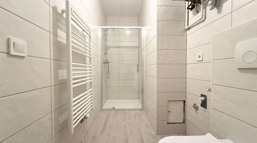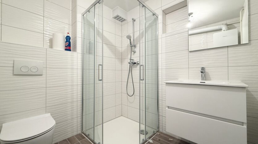 APARTMENT No. 1 is fully renovated. Located on the ground floor, it is a one-bedroom apartment with a surface area of 40 m² and has a separate private entrance. The layout includes an open-plan kitchen connected to the dining and living room, one bedroom, and a bathroom with a walk-in shower.